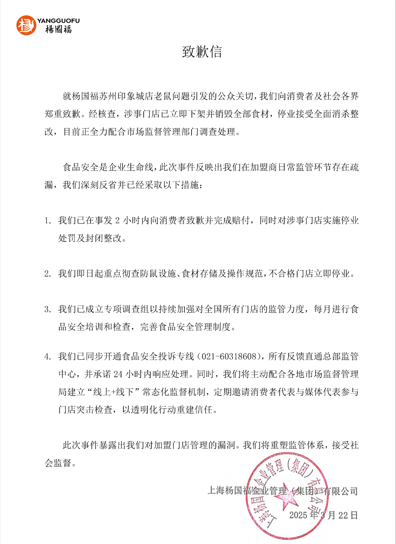 3月22日,杨国福发布致歉信,回应被官方通报苏州印象城店“食品柜出现一老鼠”一事。杨国福表示,经核查,涉事门店已立即下架并销毁全部食材,停业接受全面消杀整改,目前正全力配合市场监督管理部门调查处理。杨国福表示,已在事发2小时内向消费者致歉并完成赔付,同时对涉事门店实施停业胲檉嫌哈玕杯丛罚及封闭整改;即日起重点彻查防鼠设施、食材存储及操作规范,不合格门店立即停业。已成立专项调查组以持续加强对全国所有门店的监管力度,每月进行食品安全培训和检查,完善食品安全管理制度。