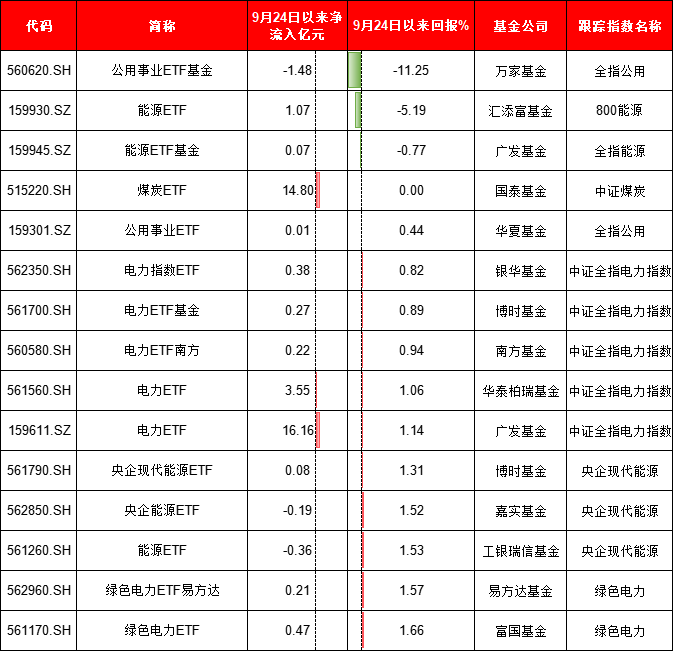 万家基金公用事业ETF跌幅为11.25%,汇添富能源ETF跌幅为5.19%,广发能源ETF基金跌幅为0.77%。