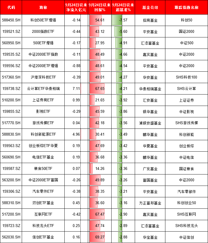 自9月24日以来,从跑赢业绩基准的情况看,工银瑞信中证1000ETF增强跑赢基准9.19%,银华2000增强ETF跑赢基准8.57%,招商基金1000ETF增长跑赢基准7.68%。