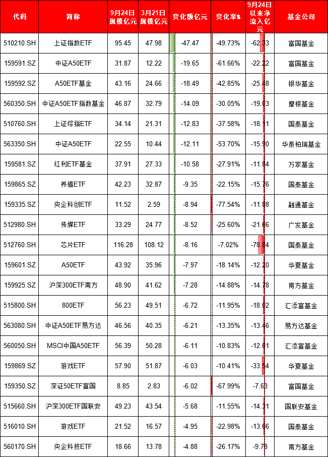 富国基金上证指数ETF规模缩水47亿元,富国中证A50ETF规模缩水19亿元,银华A50ETF规模缩水18亿元。