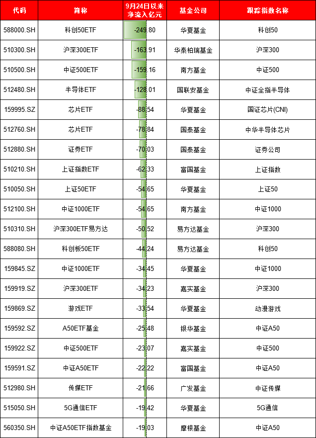 华夏基金科创50ETF区间净流出249亿元,华泰柏瑞沪深300ETF净流出163亿元,南方中证500ETF净流出159亿元,国联安半导体ETF净流出128亿元。