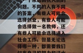大学毕业后干什么?这是一个永远困扰人们的问题。不同的人有不同的答案,有些人可能会选择创业,有些人可能会选择做一名教师,还有些人可能会选择进入社会工作。但是无论选择哪一种,都需要我们付出自己的努力和汗水,才能实现自我价值。