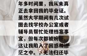 从大学毕业到现在的一年多时间里,我从未真正去拿回我的毕业证。虽然大学期间有几次试图去找学校办公室或者辅导员帮忙处理档案事宜,但每次都被婉拒。这让我陷入了困惑和迷茫之中。,无法归还毕业证的尴尬经历