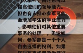 大学生是否应该参军?,大学生是否应该参军?,这是一个广泛讨论的话题,不同的人有不同的看法。有人认为参军对于大学生来说是一个很好的经历,可以增强他们的社会责任感和团队精神,同时也可以提高他们的领导能力。但也有人担心参军可能会增加学生的学业压力,影响他们对其他重要事务的处理。,无论如何,参军都是一个个人自由选择的权利。如果你对军事或者政治感兴趣,你完全可以选择不参军,享受你的大学生活。同样,如果大学生决定参军,也应考虑他们的学习、健康和个人成长等因素,确保他们在军队中的表现能够得到适当的保障和支持。